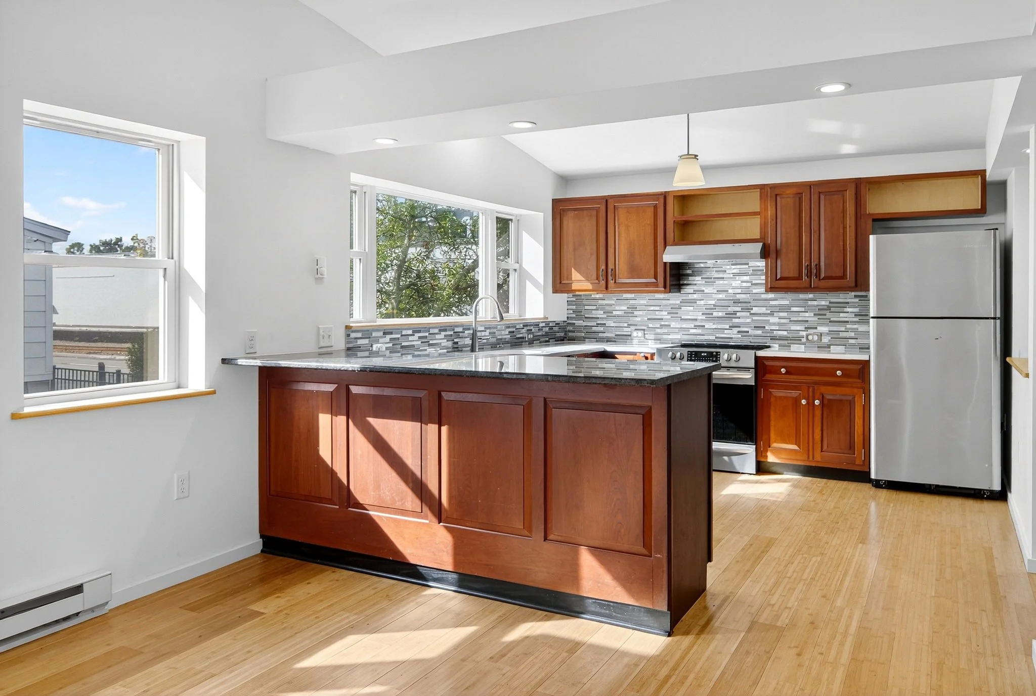 Interior: Fully renovated, vaulted ceilings, bamboo floors level one, carpet level two. Granite countertops. Designer lighting. New appliances: fridge, stove, dishwasher, W/D. New windows, new electrical wiring, new plumbing, and hard wired smoke/carbon monoxide detectors. Heat is electric baseboard, new water heater. New mini-blinds. Very clean.